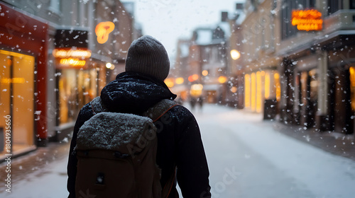snow, winter, urban, city landscape, person, walking, street, backpack, beanie, clothing, snowfall, shop, eatery, night, light, atmosphere, cold, season, pathway, figure, man, travel, adventure, exploration, outdoors, exterior, building, architecture, environment, weather, road, footpath, destination, style, scenery, landscape, winterly, urban setting, journey, city life, winter scene, city street, winter holiday, town