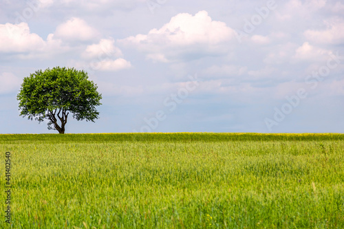 A lone green tree, located on the left, in the middle of a lush green field. The meaning of life