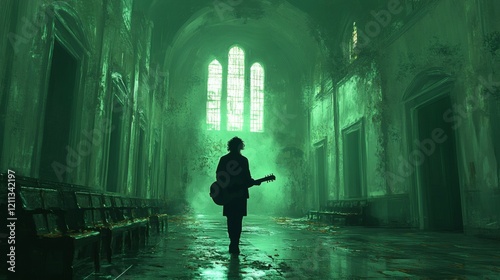 guitarist, church, green, alone, desolate, abandoned, musician, instrument, guitar, hallway, aisle, pew, gothic, architecture, window, light, shadow, silhouette, mysterious, sombre, moody, atmosphere, empty, decay, ruin, old, ancient, wall, floor, damp, dark, gloomy, eerie, silence, stillness, lonely, isolated, peaceful, serene, melancholy, dreamlike, haunting, artistic, painting, digital, art
