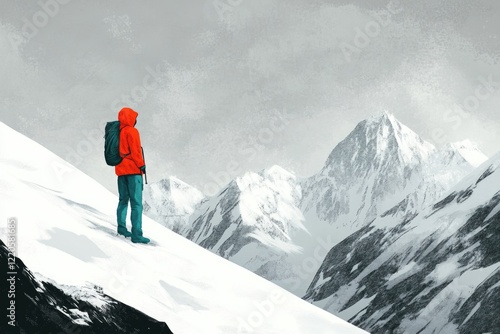 A lone hiker pauses on a snowy mountain slope, gazing at a majestic, snow-capped mountain range.