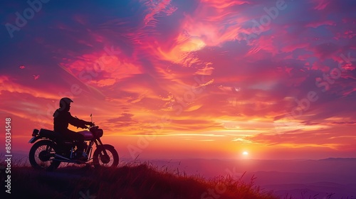 motorcycle, rider, sunset, silhouette, sky, cloud, mountain, hill, horizon, orange, pink, purple, landscape, nature, travel, adventure, freedom, peaceful, contemplative, scenic, beautiful, view, road, trip, evening, dusk, twilight, drive, journey, ride, alone, solitude, relaxation, peace, calmness, serenity, generative, ai