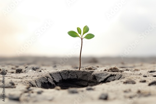 A lone seedling sprouting amidst a barren landscape, conveying hope and resilience in the face of environmental challenges.