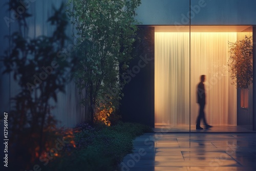 silhouette, entrance, light, shadow, mystery, solitude, paseo, ambience, atmosphere, evening, illumination, pathway, urban, modern, architecture, scene, elegant, door, facades, minimalistic, glow, night, shadow, space, mood, serene, person, journey, discovery, perspective, depiction, passage, quiet, unknown, calmness, capture, architectural, doorway