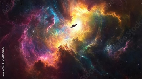 A lone spaceship ventures through a vibrant cosmic nebula, with swirling colors of orange, purple, and blue.