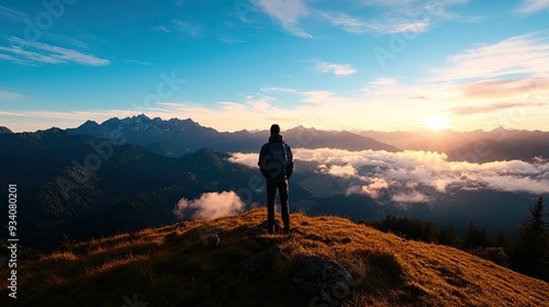 A lone traveler stands atop a mountain, gazing at a breathtaking sunset over cloud-covered valleys and majestic peaks.