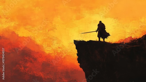 A lone warrior stands on a cliff edge, silhouetted against a fiery sunset. He holds a sword, ready for battle.