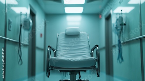 A lone wheelchair is positioned in a dimly lit hospital corridor with muted colors, capturing a moment of quiet reflection and potential for care.