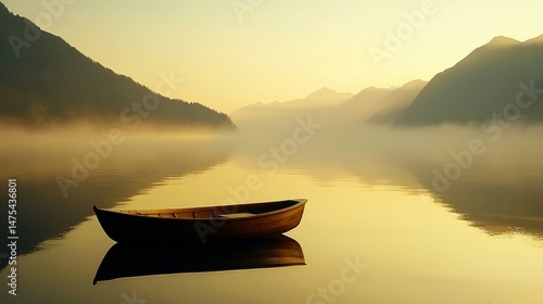 water, lake, boat, wooden, mountain, mist, fog, nature, scenic, landscape, calm, serene, peaceful, gold, sunrise, sunset, tranquil, sky, horizon, shore, wilderness, outdoors, environment, travel, vacation, adventure, solitude, isolated, stillness, quiet, atmosphere, beauty, natural, light, shadow, ripple, surface, view, distant, foreground, backlighting, silhouette, morning, evening, coast, bank