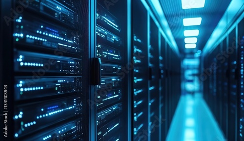 A long corridor filled with server racks on both sides, illuminated by cool blue lighting from the ceiling and the glowing lights on the servers.