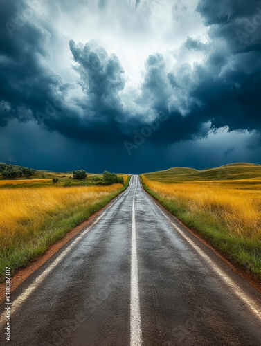 A long, empty road stretches into a stormy sky, flanked by golden grass fields that contrast with the dark clouds above. The scene evokes feelings of solitude and anticipation.