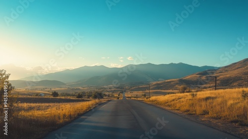 road, highway, asphalt, mountain, mountain, range, vale, field, grass, sky, blue, sunset, sunrise, sun, horizon, landscape, rural, country, nature, travel, journey, adventure, freedom, open, scenic, beautiful, picturesque, peaceful, serene, autumn, fall, gold, warm, light, cloud, wispy, perspective, distance, long, winding, curve, direction