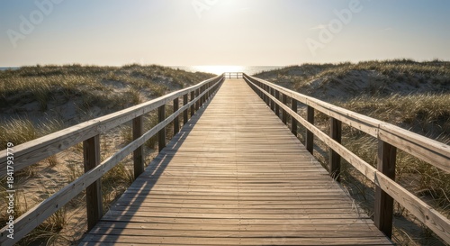 A long wooden boardwalk pathway extends toward the horizon over coastal dunes under a bright, sunny sky ,outdoor ,vacation ,summer