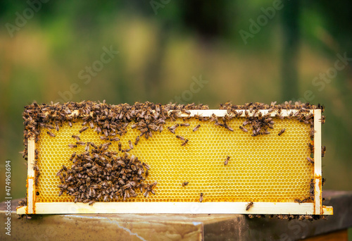A lot of bees on honeycomb, woking on a honey, natural product, food concept