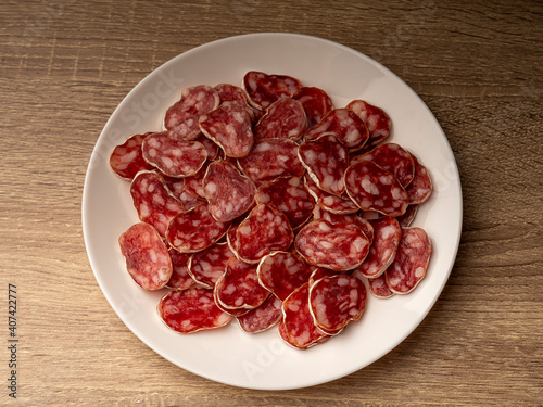salami, meat, sausage, slice, fat, cut, italian, pork meat, smoked, spice, piece, culinary, product, wood, garlic, lunch, pepper, red, studio shot, photo, nourishment, food and drink, italian food, salty, deli, beef, eating, feast, wooden, table