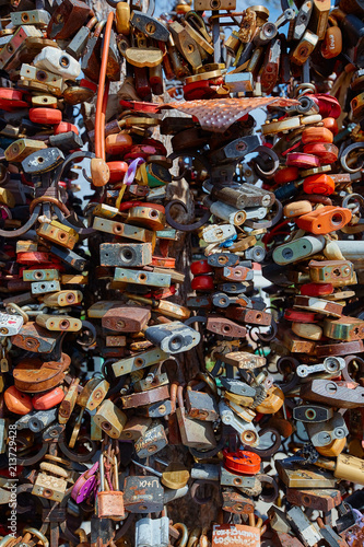 A lot of wedding castles. The lock is closed on the wedding day, the key is thrown into the river from the bridge so that no one can open the lock. The concept of a strong marriage and true love