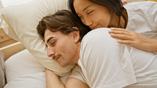 couple, interracial, cuddling, bedchamber, affection, man, woman, love, indoor, comfort, human relationships, togetherness, intimacy, romance, partner, hugs, happiness, casual attire, home, diversity, peaceful, bedding, resting, leisure, lifestyle, relaxation, trust, together, cohabitation, gentle, serene, joy, young, adult, multicultural, bonding, commitment, pillow, comfortable, partiality, cuddled, tenderness, furniture, natural, relaxed, emotional, secure, companionship, closeness