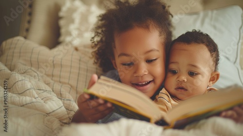 A loving sister and brother are enjoying a peaceful moment while reading a book together on the couch.