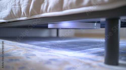 bed, comforter, rug, bedchamber, furniture, home, interior, design, decor, pattern, blue, white, metal, leg, low angle, shot, underneath, home decor, interior design, bedding, room, house, apartment, residence, carpet, textile, fabric, floor, indoor, domestic, household, comfort, sleep, rest, relaxation, modern, contemporary, style, minimalist, clean, simple, neutral, calm, serene, peaceful