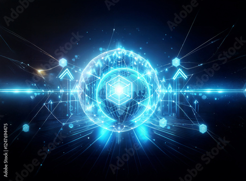 A luminous blue sphere with a central cube radiates light, connected by glowing lines and nodes against a dark backdrop, suggesting futuristic technology and network connectivity.