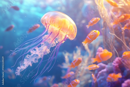 A luminous jellyfish gracefully floats amidst vibrant coral and playful clownfish in a sunlit ocean scene.
