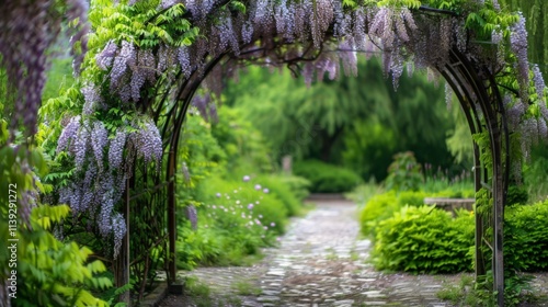 A lush garden archway covered in wisteria and summer vines