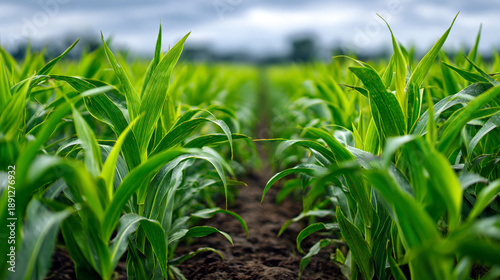 corn, field, green, plant, young, row, agriculture, farm, farming, growth, crop, cultivation, land, rural, landscape, nature, environment, development, cornfield, greenfield, sprout, leaf, shoot, dirtied, earth, ground, cloudy