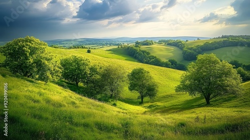 green, hill, hillside, rolling hills, cloudy sky, nature, landscape, scenic, grass, meadow, field, tree, forest, summer, beautiful, peaceful, calmness, serenity, beauty, natural, vibrant, bright, sunlight, shadow, perspective, depth, horizon, distant, view, aerial, aerial view, picturesque, stunning, breathtaking, wonder