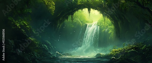 A lush, green waterfall cascades through a rocky archway in a mystical forest.