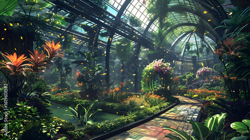 A lush greenhouse interior with vibrant flora and a glass dome structure overhead with sunlight streaming in .