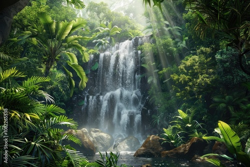 A Lush Jungle Waterfall with Sun Rays Shining Through the Canopy