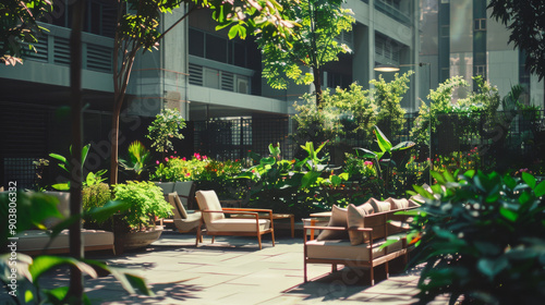 greenery, sunlit, seating, tranquil, oasis, city, building, nature, modern, plant, relax, shade, escape, foliage, day, architecture, serene, lush, chair, interior, open space, design, peaceful, landscape, contemporary, cosy, fresh, renewal, open air, plush, resilience, retreat, garden, rejuvenating, harmony, setting, ornamental, comfortable