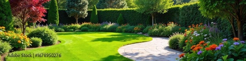 A lush, vibrant backyard oasis featuring meticulously manicured lawns, colorful flowerbeds, and a charming stone patio Perfect for relaxation and outdoor entertaining , flowers, relaxation