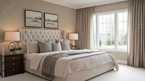 A Luxurious Bedroom with a Large Bed, Neutral Colors, and a Window View