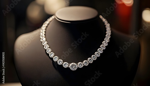 A luxurious diamond necklace on display in a jewelry store, front view, with soft lighting