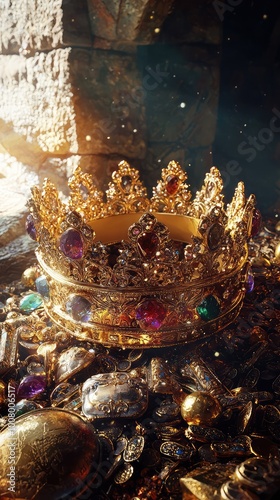A luxurious gold crown resting on a pile of sparkling treasures, radiating elegance and opulence in a mystical setting.