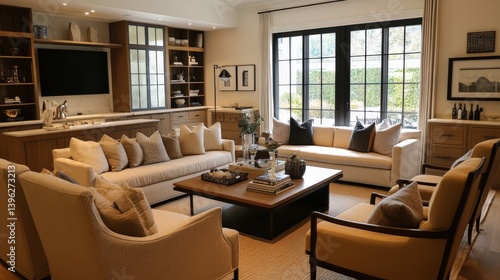 sofa, chair, pillow, rug, window, drape, interior, design, living, room, comfortable, modern, elegant, wooden, cabinet, shelf, decor, art, lamp, book, vase, plant, cushion, light, neutral, style, contemporary, home, furniture, luxury, roomy, architecture, panel, entertainment, seating, surface, texture, pattern, placement, arrangement, accessory, lighting, ambience, composition, construction, detail, perspective