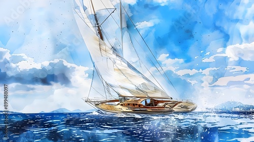 A luxurious yacht sails on vibrant blue ocean waves, its white sails billowing against a bright blue sky with fluffy white clouds, creating a sense of freedom and adventure.