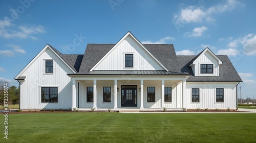 house, residential, home, architecture, modern, luxury, estate, exterior, yard, lawn, grass, building, property, real estate, blue, roof, brick, green, sky, suburban, family, design, garden, new, construction, living, facades, dwelling, residence, clear, summer, bright, sunny, upscale, contemporary, elegant, landscape, neighbourhood, scenery, structure, villa, lifestyle, backyard, housing, masonry, detached, front, window