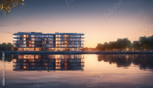 A luxury riverside condominium, the building is decorated with glass and steel, reflecting on the calm water surface in the evening. - Generative AI