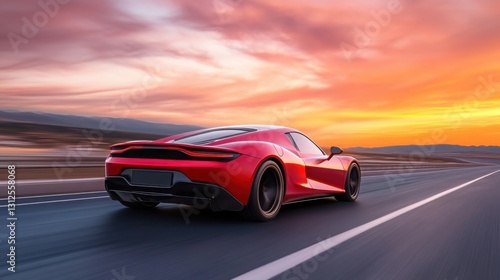 A luxury sports car speeding down a highway at sunset, sleek and dynamic