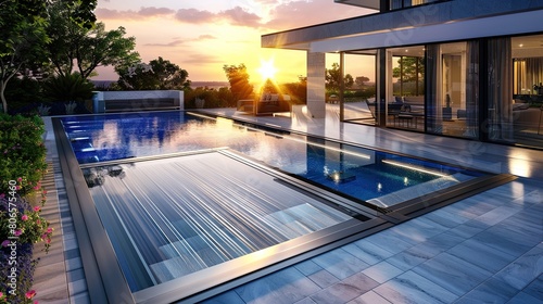 A luxury villa's pool with a retractable cover, seamlessly blending with the garden landscape at sunset