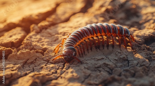 A macro shot of a centipede on dry, cracked soil, showcasing its intricate exoskeleton and vibrant orange-brown coloration under natural sunlight.