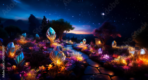 beautiful, beauty, bright, calm, colourful, crystal, crystal, dreamlike, dusk, enchantment, aethereal, evening, fairyland, fantasy, flora, flower, flower, garden, glow, glowing, illuminated, landscape, light, luminescence, magic, magical, mystical, nature, night, night time, outdoors, outside, path, peaceful, plant, relaxing, scenery, scenic, serene, shine, sky, sparkle, star, starry sky, star, stone, trail, tranquil
