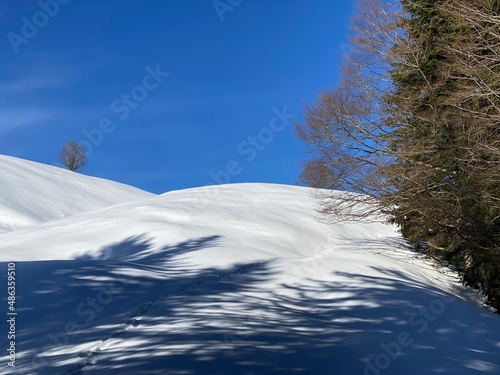 A magical play of light and shadow on a pure white snow cover in a mixed alpine forest, Schwägalp mountain pass - Canton of Appenzell Ausserrhoden, Switzerland (Schweiz)