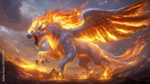 mythical, creature, fire, lion, wing, wonder, symbolic, flames, powerful, thunder, aethereal, legend, celestial, surreal, vision, majestic, dynamic, magic, glowing, fantasy, aura, vibrant, stunning, flight, artistic, fierce, phoenix, enchanting, roaring, ferocious, beast, imaginative, legendary, energy, winged, wild, art, epic, sky, colourful, nature, ancient