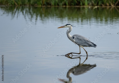 A magnificent grey heron wading through shallow water, hunting fish in a tranquil wetland environment under clear skies ,heron ,standing ,feeding