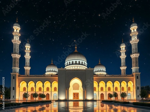 A magnificent mosque illuminated at night, showcasing its stunning architecture and intricate details under a starry sky. A captivating blend of faith, art, and culture