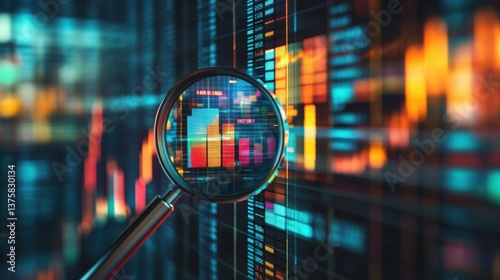 A magnifying glass focuses on colorful financial data charts, illustrating market analysis and trends in a digital environment.