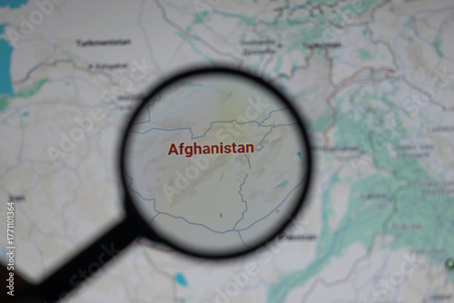 A magnifying glass highlights the country of Afghanistan on a world map, representing focus on its national boundaries, geopolitical relevance, and role in international geography and travel.