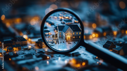 A magnifying glass hovers over a bustling neighborhood on a map, with a house standing out, symbolizing the careful selection of the perfect home in a vibrant area